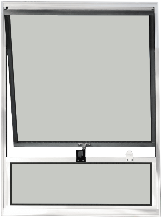 | Modelo de Abertura | - Abertura ou fechamento por meio da haste localizada na parte inferior da folha. Abertura de aproximadamente 45º. - Possui uma folha fixa inferior de vidro (bandeira). |