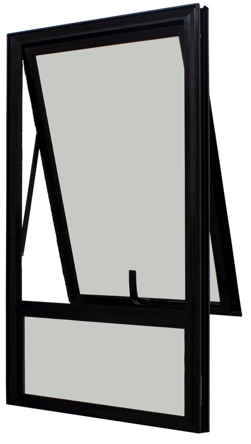 | Modelo de Abertura | - Abertura ou fechamento por meio da alavanca localizada na parte inferior da folha. Abertura de aproximadamente 90º. - Possui uma folha fixa inferior de vidro (bandeira). |