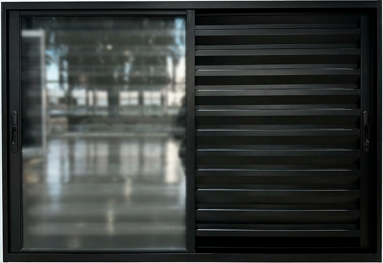 | Modelo de Abertura | - 1 folha móvel de vidro à esquerda. - 1 folha móvel com veneziana ventilada à esquerda. - 1 folha móvel com veneziana sem ventilação à direita. |
