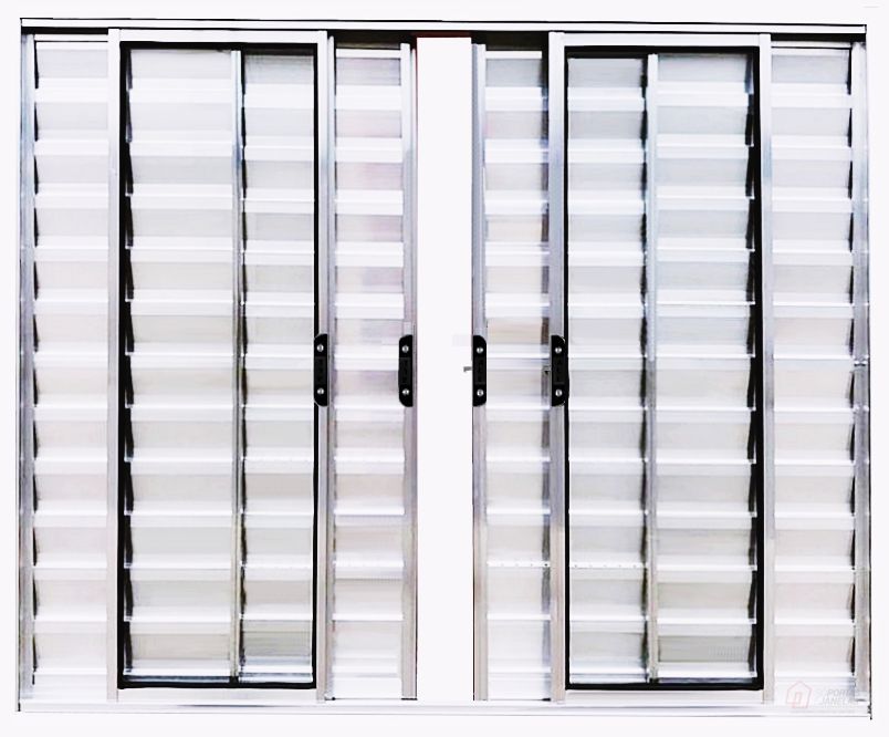 | Modelo de Abertura | - 2 folhas móveis centrais de vidro. - 2 folhas móveis centrais com venezianas ventiladas. - 2 folhas fixas laterais com venezianas sem ventilação. |