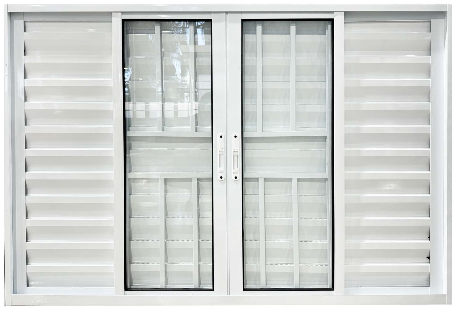 | Modelo de Abertura | - 2 folhas móveis centrais de vidro. - 2 folhas móveis centrais com venezianas ventiladas. - 2 folhas fixas laterais com venezianas sem ventilação. |