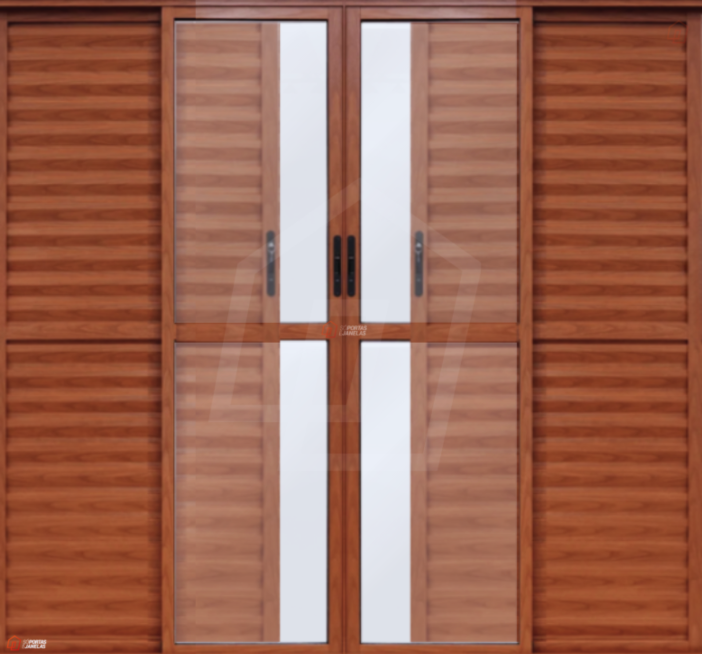 | Modelo de Abertura | - 2 folhas móveis centrais de vidro. - 2 folhas móveis centrais com venezianas ventiladas. - 2 folhas fixas laterais com venezianas sem ventilações. |